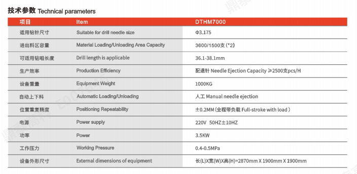 DTHM7000 雙臺面配退針機適用于鉆針房取代傳統(tǒng)的手工作業(yè),可對中0.1mm 至中6.5mm 范圍內(nèi)的鉆頭實現(xiàn)鉆針的信息綁定、自動 配針、自動退針等工序。雙工作臺面可保證不停機換料,提升作業(yè)效益,可兼容多批次多型號的配針作業(yè)。